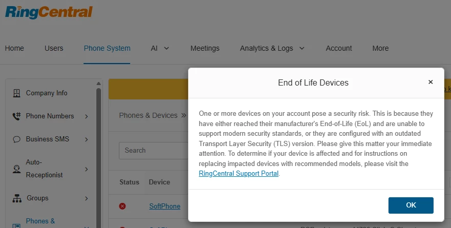 I just jumped into the RC admin portal to check something and was presented with a pop-up alert stating “One or more devices on your account pose a security risk” and goes on about something being end-of-life and posing a security risk. OK, that seems possible.