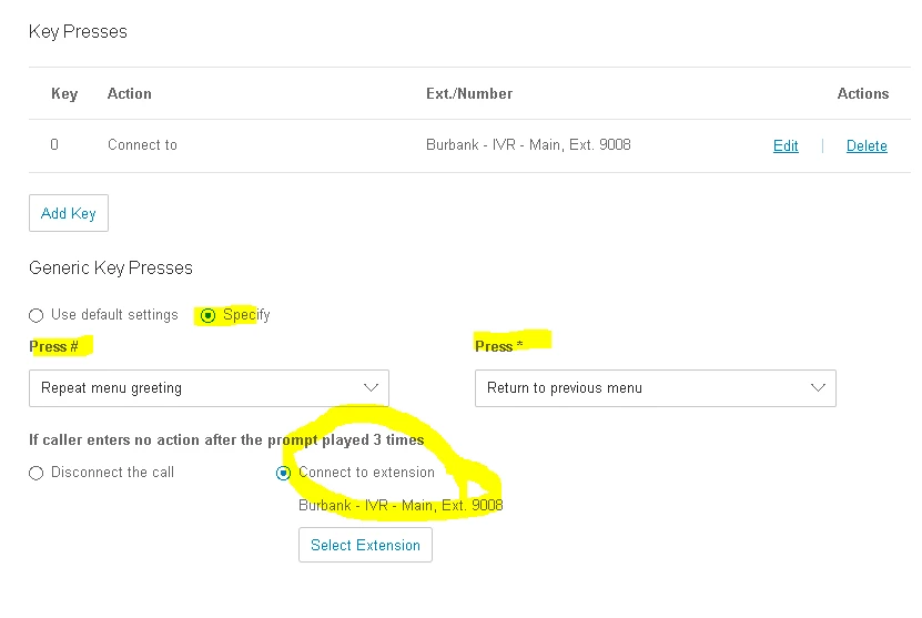 I am trying to setup an IVR Menu for the virtual receptionist. The caller gets greeted and then they can have the option to get routed to the directory, the directions menu, dial the extension, or dial 0 for operator. I am having issues trying to setup the directions menu. There are 3 options the caller can choose from, If they are coming from the Madison area, press 1, if they are coming from the Chicago area, press 2, and if they are coming from the Green Bay area, press 3. Then when they choose a location, they have the option between picking from 2 different warehouses. If going to 2880 N 112th St Location, Press 1. If going to the 1300 or 1290 Glenview Place Location, press 2. Then once they choose a warehouse, the next prompt will give them the directions. Can anyone give me a step by step instruction on how to set this up? I tried and it gets stuck on 2 and will only give me directions from the Chicago area, then it will only give me the 1300 or 1290 Glenview Place location. Then it will go back to the directions menu and start over without giving me directions. I am not sure what I am doing wrong