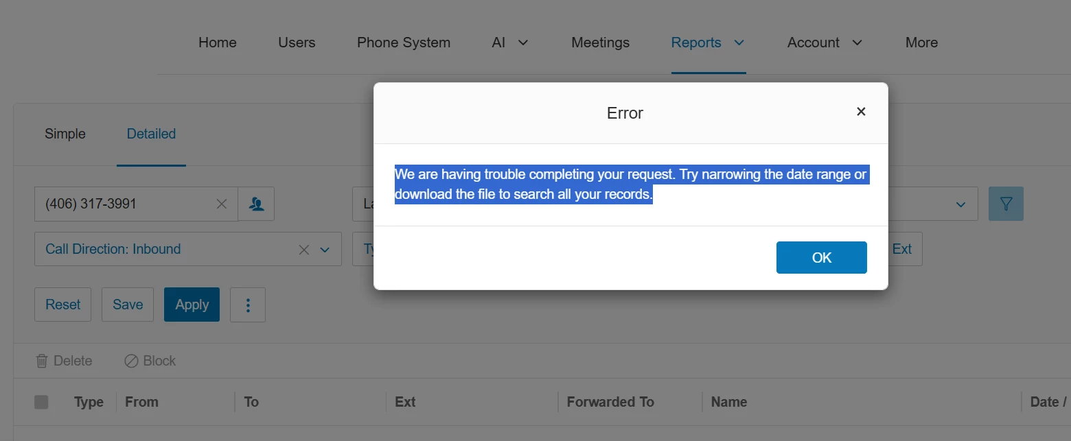 We are having trouble completing your request. Try narrowing the date range or download the file to search all your records.
