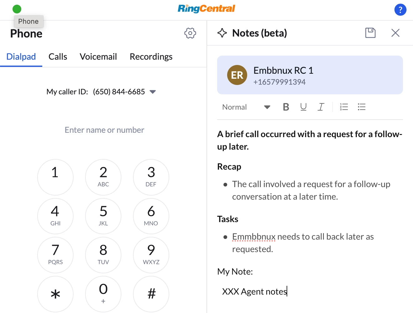 We see in Ring Central App Connect, the call logs show “from auto logging” instead of what was typed in during the call