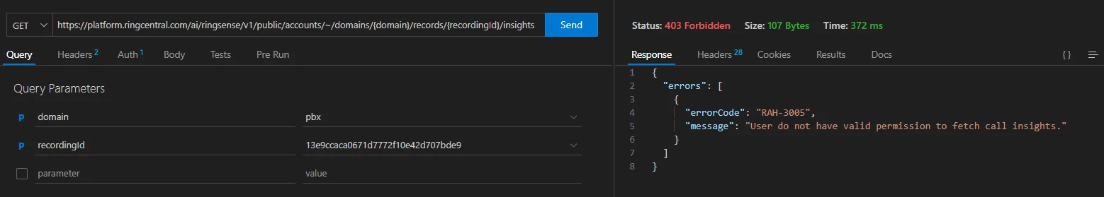 I’ve already added the required RingSense scopes to my application, but I still cannot retrieve the transcript and summary from the RingSense API. Every request returns a 403 Forbidden error.