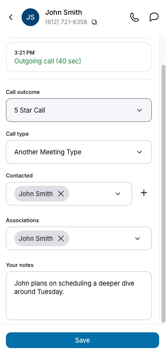 • Provides the ability to add custom notes and categorize call outcomes.
