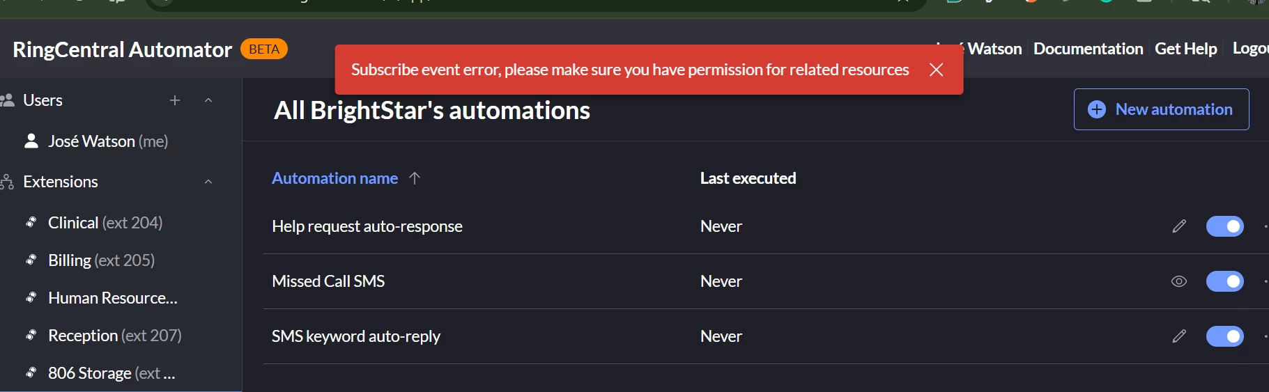 I created this RingCentral Automator and I am getting this error when I attempt to disable to edit.